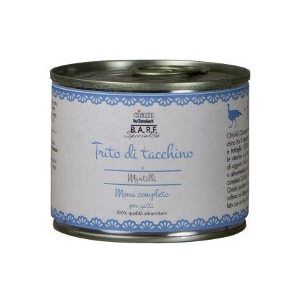 Dr Clauder's BARF Trito di Tacchino Menu Completo Umido Per Gatti è un alimento completo per gatti adulti. Il prodotto è preparato con una cottura a vapore per preservare le caratteristiche nutritive di tutti gli ingredienti. È un insieme perfetto costituito al 100% da carne di Tacchino, con mirtillo rosso e oli. Questo alimento completo è formulato rispettando le peculiarità digestive del gatto.