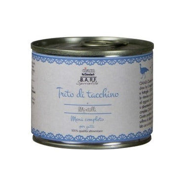 COMPOSIZIONEsottoprodotti di origine animale: Tacchino (cuore, fegato, petto e collo) (94%), mirtilli (4%), sostanze minerali (1%), olio di pesce (olio di fegato di merluzzo) (0,5 %), olio vegetale (olio di germe di grano) (0,5%).
