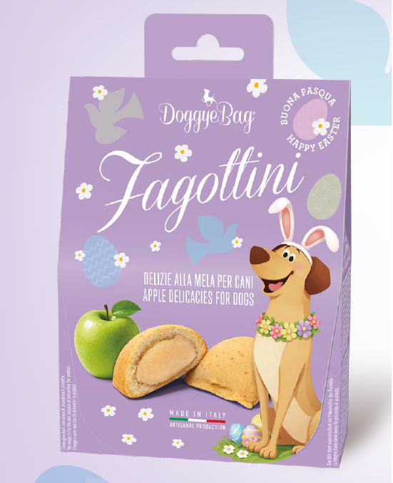 Doggye Bag Fagottini sono una fantastica idea regalo per le festività Pasquali, dei golosi biscottini di pasta frolla ripieni alla mela che conquisteranno fin da subito il cuore e il palato di Fido.
