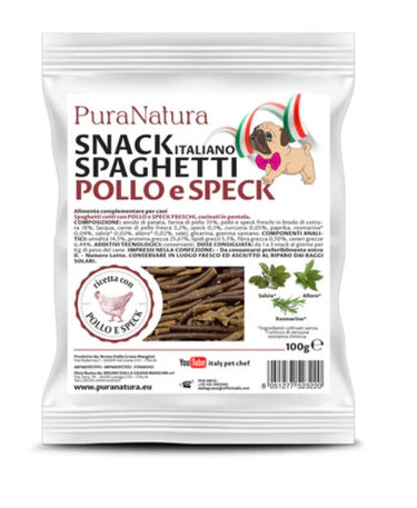 Gli snack per cani spaghetti Officinalis pollo, sugo di speck e curcuma, si presentano come uno snack morbido a forma di spaghetto, ideale in ogni momento della giornata come merenda o ricompensa.